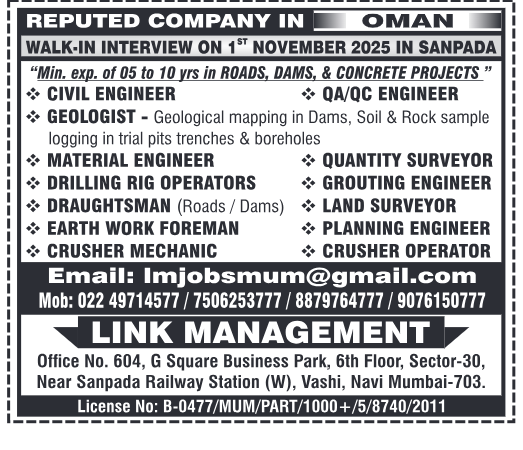 • Minimum 5 to 10 years of experience in Roads, Dams & Concrete Projects.