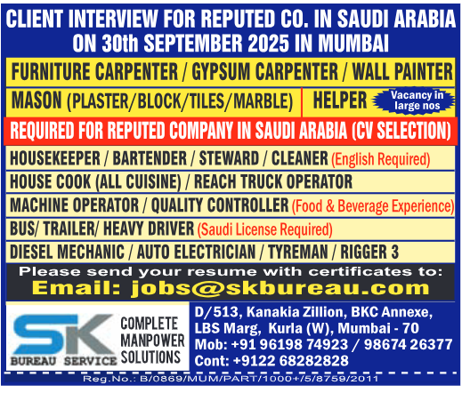 πŸ“ Location: Mumbai (SK Manpower Bureau – Kurla, BKC Annexe)